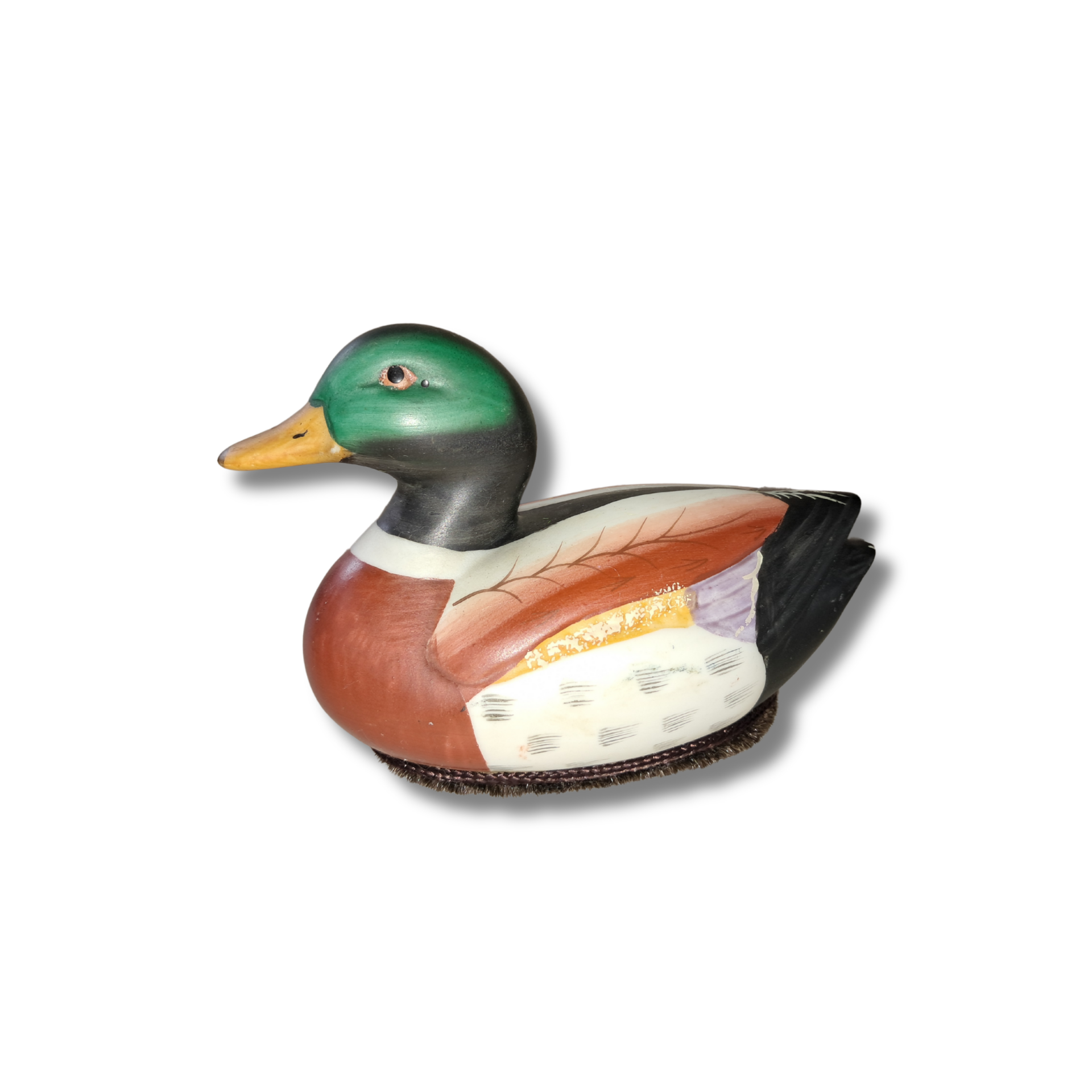 A charming blend of form and function, this vintage Jasco ceramic mallard duck lint brush is a true one-of-a-kind find from the 1980s that will delight collectors and vintage lovers alike. With its hand-painted detail, rich earthy tones, and lifelike mallard features, this piece doubles as both a decorative figurine and a discreet, practical grooming tool—bringing a bit of old world charm to your vanity or entryway.