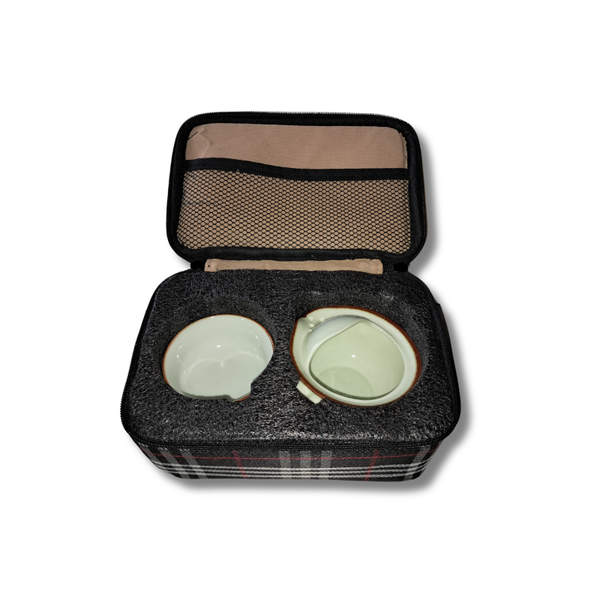 - Compact and portable travel teapot, elegantly stored in a plaid case