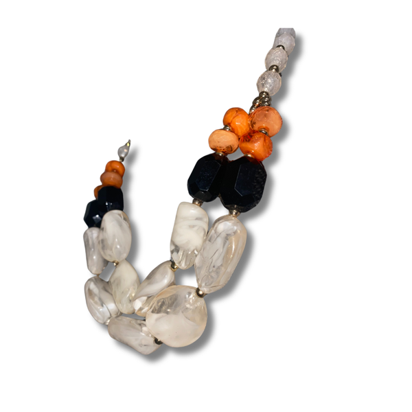 Each bead is uniquely patterned, offering a subtle swirl of whites and creams that give the piece depth and texture. The toggle clasp adds a touch of charm and functionality, making it easy to wear while enhancing its vintage appeal. With its striking silhouette and sculptural feel, this necklace makes a bold statement—perfect for anyone who appreciates curated collectibles and nostalgic items with old world charm.