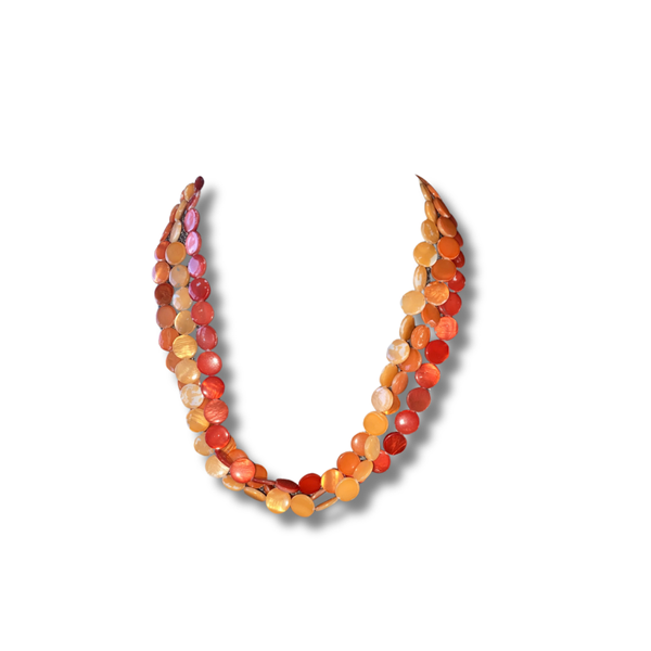 Embrace the beauty of handmade jewelry with this one-of-a-kind vintage mother of pearl beaded necklace, a piece that radiates warmth and sophistication. Featuring three delicate strands of orange-red shaded beads, this boho fashion accessory captures the essence of old-world charm, making it a standout addition to any collection.