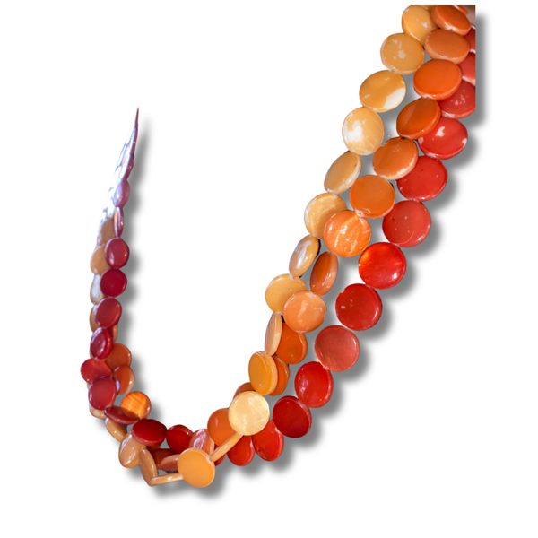 - Vintage three-strand necklace with orange-red mother-of-pearl shaded beads