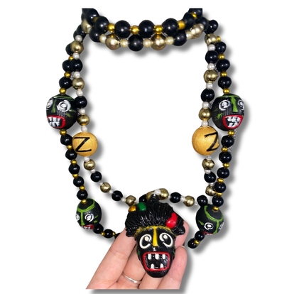 Featuring colorful beads and distinctive pendants, this one-of-a-kind find serves as both a wearable piece of history and a cherished keepsake. The 23" necklace with a bold 2" pendant, accompanied by the 23" chain with 1" pendants, creates a striking look that pays homage to the legendary Zulu Krewe, a cornerstone of Mardi Gras tradition. Whether you're a fan of curated collectibles or searching for rare and unique gifts, this set is a must-have for Carnival enthusiasts.